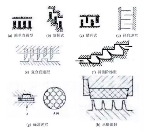 迷宮密封是在轉(zhuǎn)軸周圍設(shè)多個(gè)依次排列的環(huán)行密封齒,齒與齒之間形成一系列截流間隙與膨脹空腔,被密封介質(zhì)在通過(guò)曲折迷宮的間隙時(shí)產(chǎn)生節(jié)流效應(yīng)而達(dá)到阻漏的目的,是離心式壓縮機(jī)級(jí)間和軸端最基本的密封形式,根據(jù)結(jié)構(gòu)特點(diǎn)的不同,可分為平滑式、曲折式、階梯式及蜂窩式等四種類型。