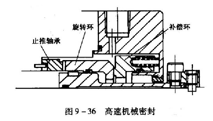 高速機械密封見圖9一36所示,適用于大軸徑及轉(zhuǎn)速高達10000r/min的情況。由圖中可知,該密封結(jié)構(gòu)的旋轉(zhuǎn)環(huán)(動環(huán))由止推軸承定位,由鍵傳遞轉(zhuǎn)矩。旋轉(zhuǎn)環(huán)的浮動性好。此結(jié)構(gòu)有兩個優(yōu)點: